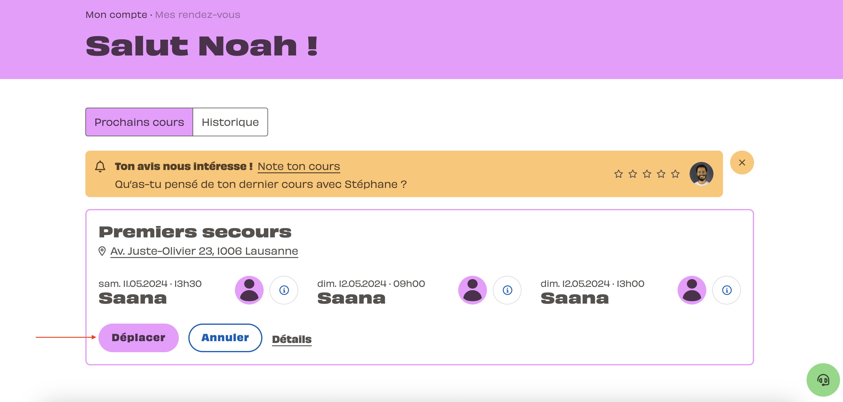 Pour les cours privés avec un moniteur, si tu es en retard, tu peux appeler ton moniteur et t'arranger directement avec lui.